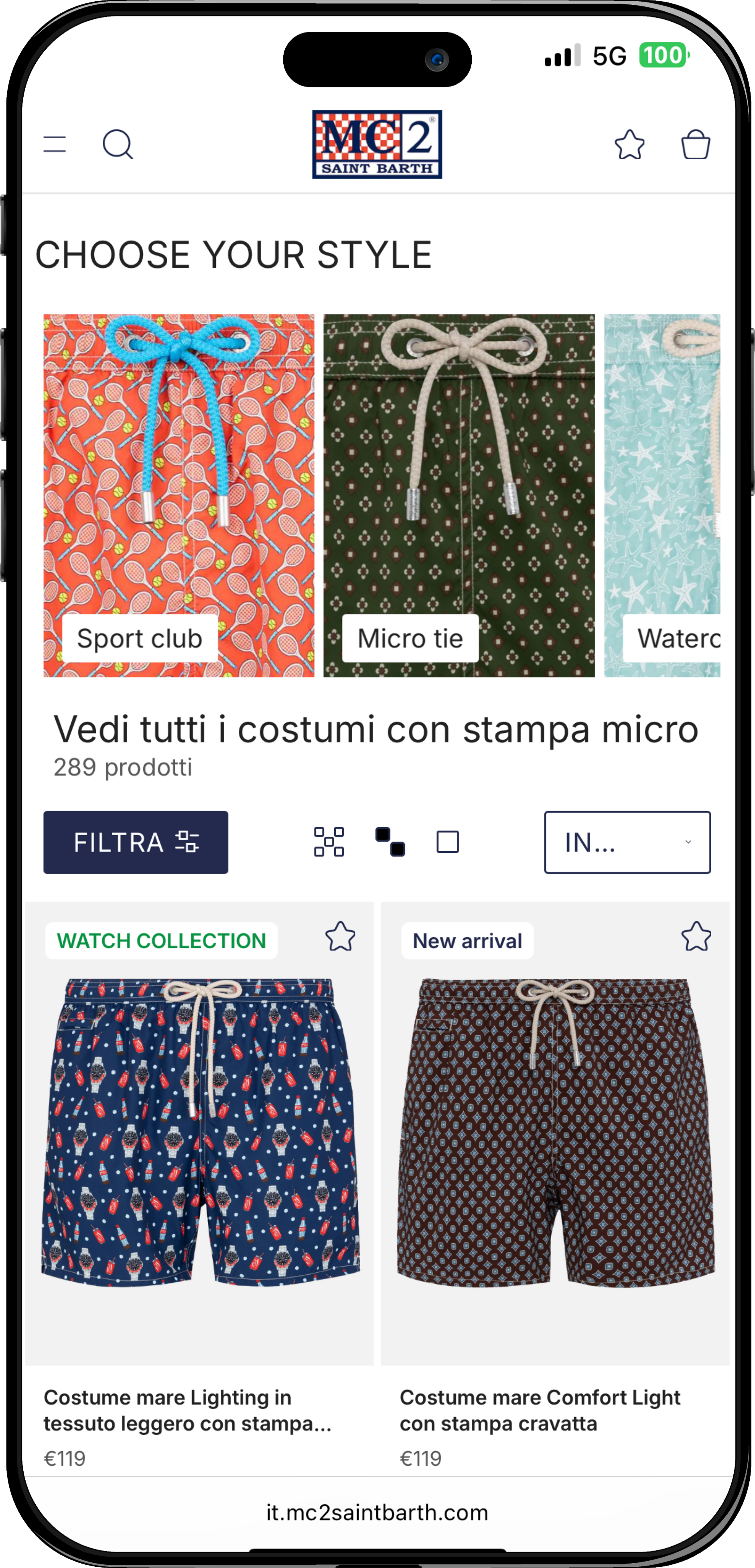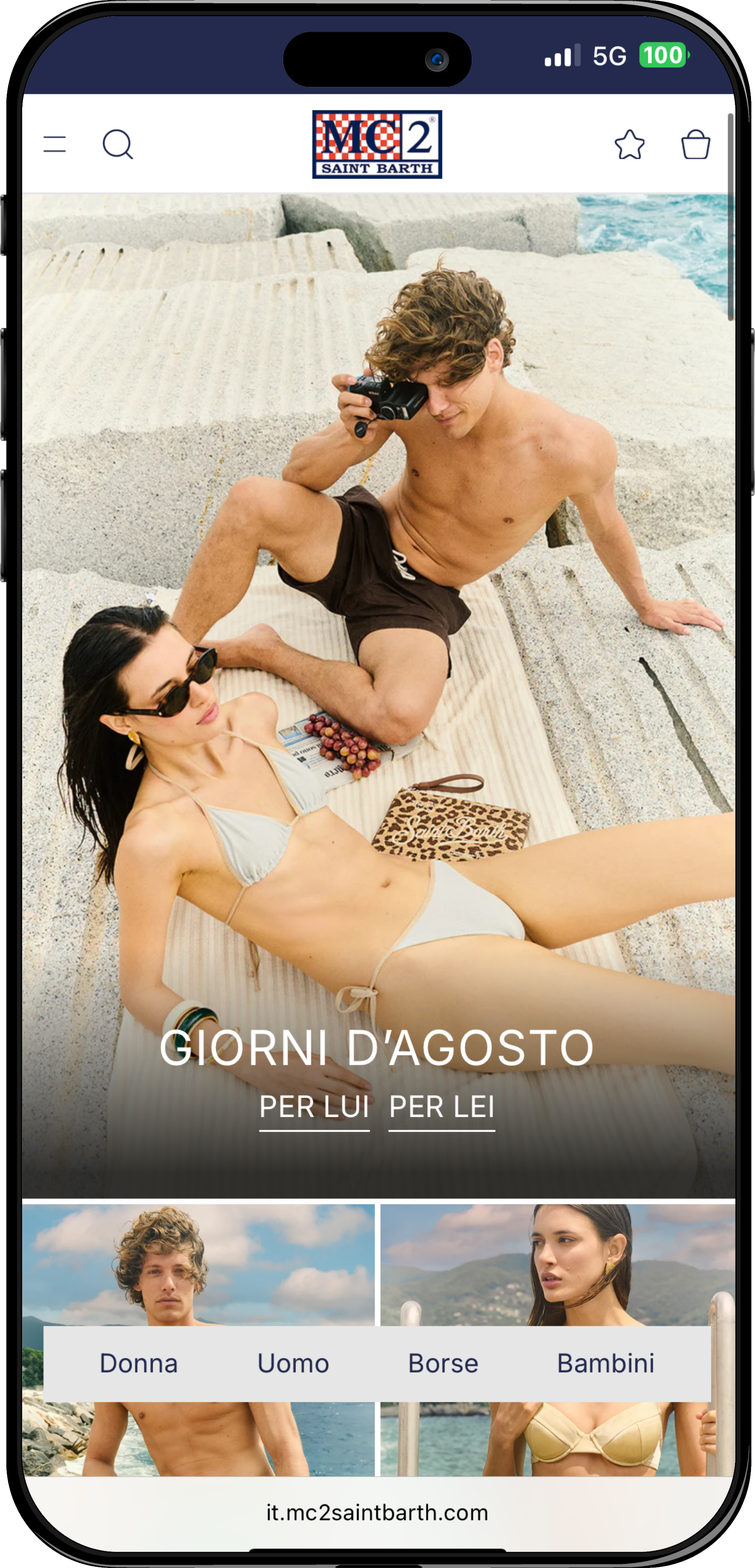 Sin dal primo wireframe abbiamo ragionato insieme a MC2 Saint Barth su un design in ottica mobile first: è nato così il mini-menu persistente in bottom-nav che consente di saltare fra Uomo, Donna, Kids e Bags con un semplice tocco.